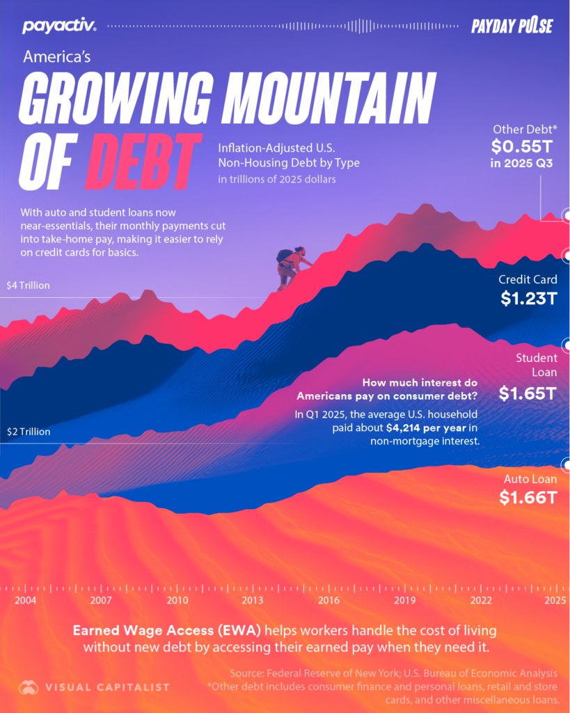 Payactiv partnered with Visual Capitalist to explore America’s Growing Mountain of Debt. When money is earned on one schedule and bills arrive on another, even strong budgeting habits can fail. Over time, that timing mismatch can turn borrowing from an occasional fallback into a repeating monthly pattern. Follow along for this breakdown of America’s latest debt trends.